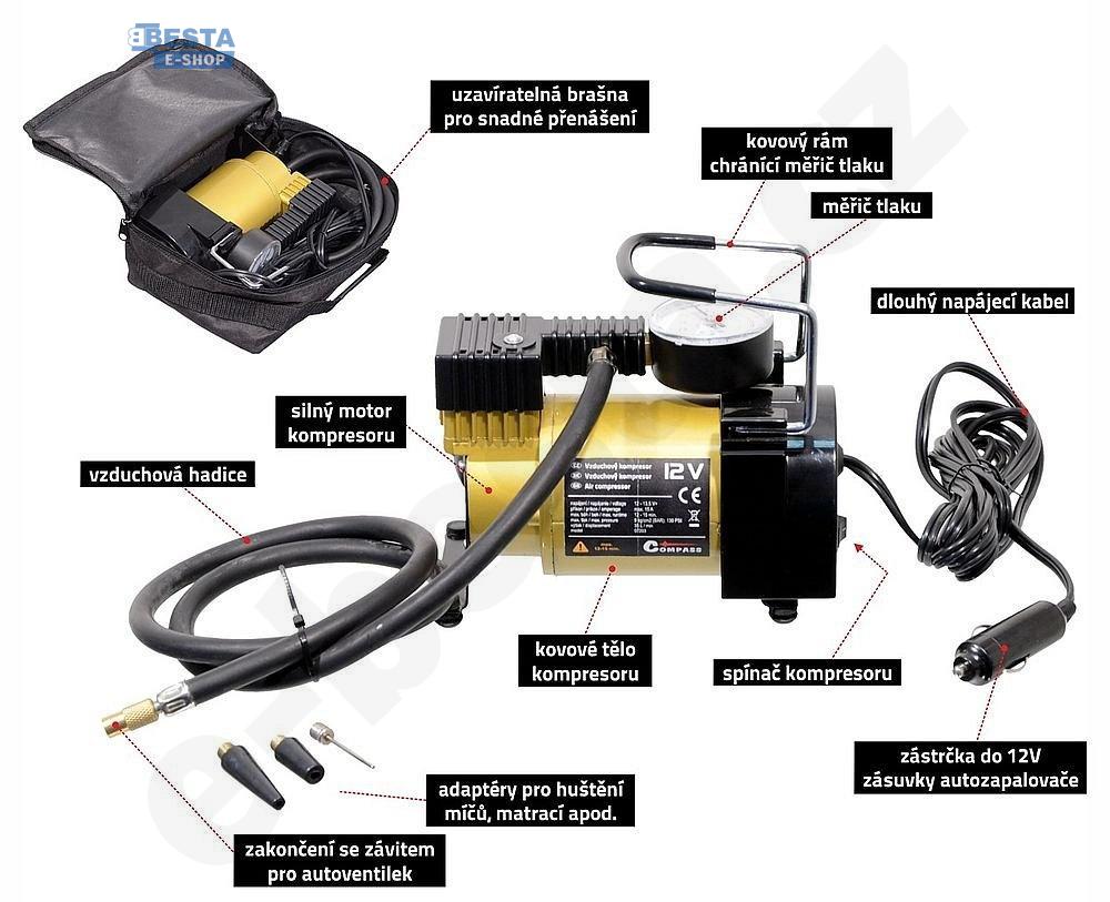 - maximální tlak 9 bar/140 PSI - napájení 12 - 13,5V DC - dodáváno v nylonové brašně - maximální doba chodu 10 min. - plnící množství 35l/min.