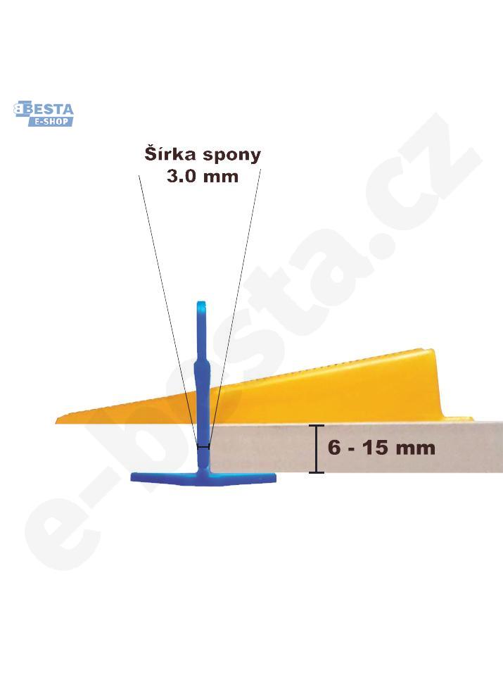 - náhradou za klasické křížky na dlažbu - spony jsou určeny k jednorázovému použití Využití: - pro 3 až 15 mm silnou dlažbu nebo obklad - pro všechny rozměry dlažeb a obkladů (např. 100 x 50 cm a podobně) - v interiéru i exteriéru - při tvorbě spádů do odtoku, ve sprchovém koutě - na křížový, diagonální nebo parketový spoj - na schodech a soklech - u nerovnoměrné plochy podlah, stěn a dlaždic - vyrovnávací systém nevyužijtete pouze u mozaiky na síťce Upozornění: - při klasické dlaždici (kde hrany dlažby či obkladu nejsou řezané do pravého úhlu, t.j. do 90 °) bude výsledná spára širší, než šířka spon. Například pokud použijete 3 mm sponu LEVELYS při klasické dlaždici, tak výsledná spára bude 3,5 mm a více (3 mm bude, kde se dlaždice spojí a opřou o sponu). - při rektifikované dlaždici (kde hrany dlažby nebo obkladu jsou řezané do 90 °, tj pravého úhlu) bude výsledná spára stejná, jako šířka spony. Například pokud použijete 3 mm sponu LEVELYS při rektifikované dlaždici, tak výsledná spára bude také 3 mm.