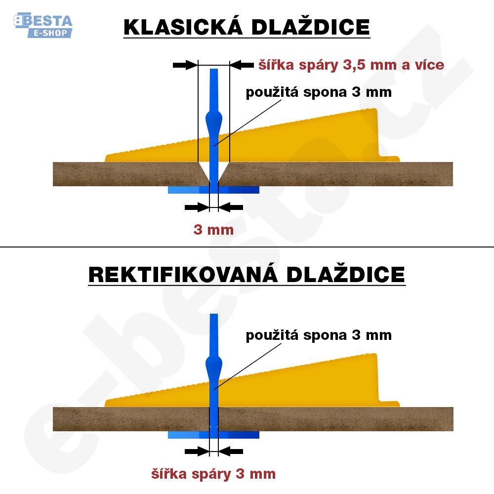 - při rektifikované dlaždici (kde hrany dlažby nebo obkladu jsou řezané do 90 °, tj pravého úhlu) bude výsledná spára stejná, jako šířka spony. Například pokud použijete 3 mm sponu LEVELYS při rektifikované dlaždici, tak výsledná spára bude také 3 mm.
